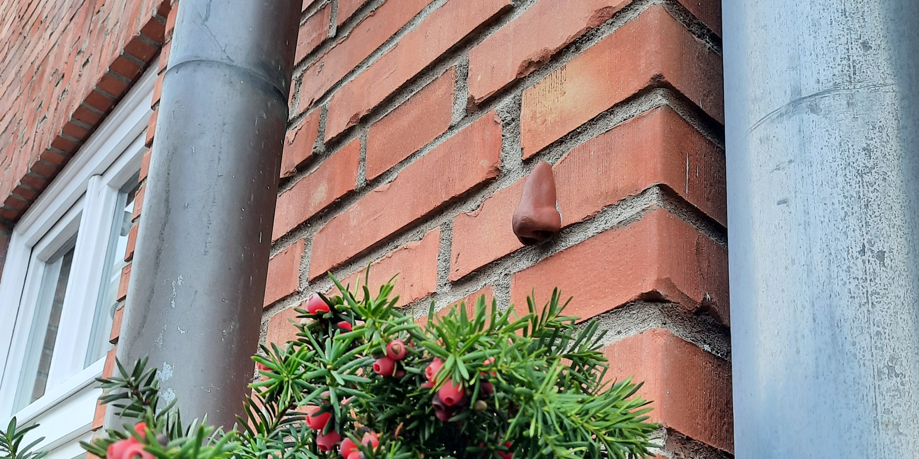 Wir gingen auf Nasenjagd. Unser Eindruck war, dass die Nasen nur auf hübschen Backsteinfassaden zu finden waren. Zwei weitere Nasen sollten wir an diesem Tag noch finden und diese waren in der Tat alle an Backsteine geheftet (wir schauten auch auf andere Fassadentypen). Manchmal in für uns bequem erreichbare Höhen, manchmal auch für große Menschen nur schwer erreichbar.